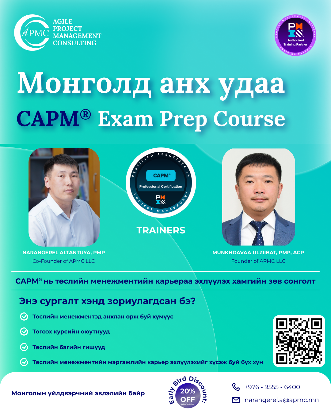 Төслийн менежментийн карьераа эхлүүлэх хамгийн зөв сонголт! CAPM® нь төслийн менежментийн суурь мэдлэг, ур чадвараа баталгаажуулах олон улсын сертификат юм.